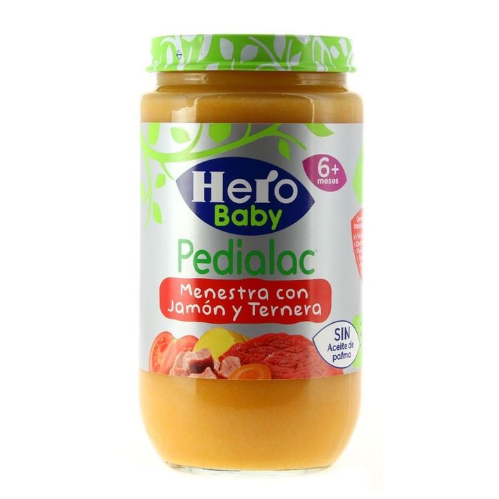 El tarrito Hero Baby Pedialac sin lactosa, huevo ni gluten está elaborado con aceite de oliva, evitando así las alergias e intolerancias de tu bebé. Alimenta a tu pequeño con los mejores productos de Hero Baby Pedialac, que han sido diseñados con la cantidad de nutrientes necesarios para el correcto desarrollo del bebé. Esta papilla de guiso de verduras con ternera y jamón presenta un sabor delicioso y no contiene lactosa, huevo ni gluten, lo que minimiza el riesgo de alergias e intolerancias en la alimentación de los más pequeños de la casa. Tampoco contiene conservantes ni colorantes, garantizando que es 100% natural.